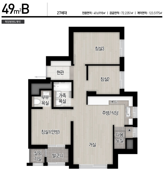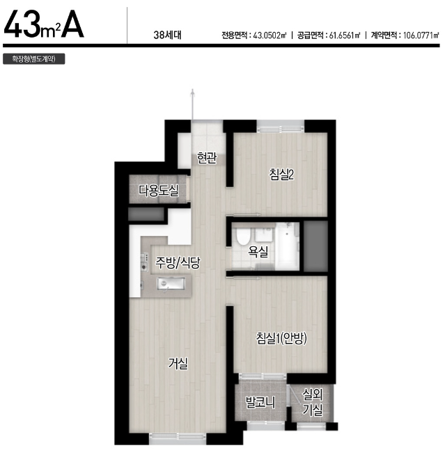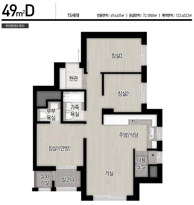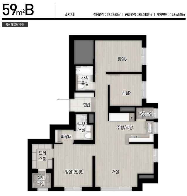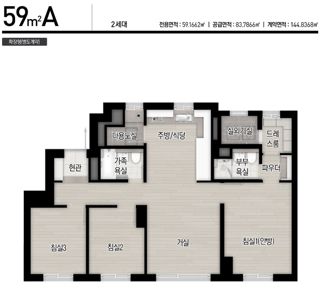 43타입은 방이 2개네요. 49타입은 방이 3개로 실용적입니다. 59타입은 25평에서 흔치않은 4Bay입니다.