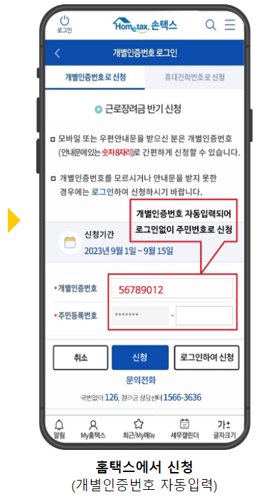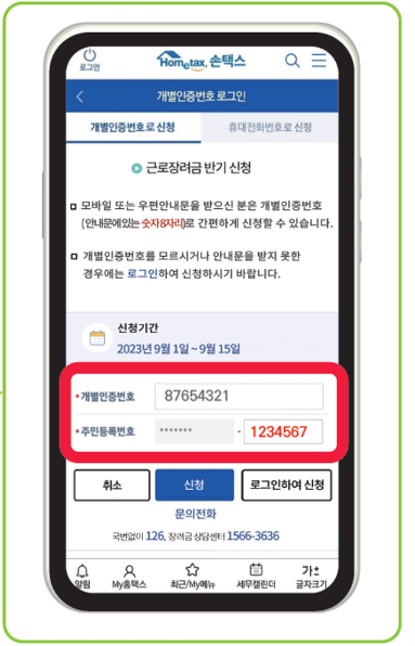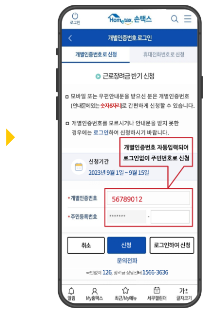 전화 ARS나 국세청 홈택스 사이트 또는 앱에서 근로장려금 반기 신청을 할 경우에는 개별인증번호 8자리가 필요합니다. 따라서 개별인증번호를 확인해야 합니다. 아래의 방법으로 개별인증번호를 확인하실 수 있습니다.