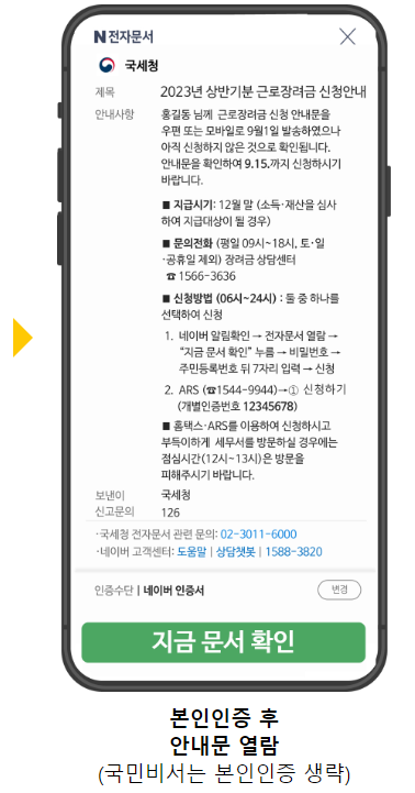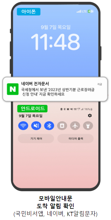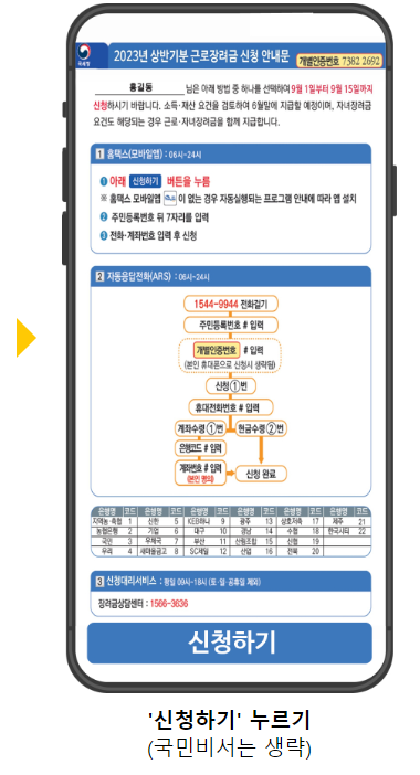 ✔ 국민비서, 네이버 전자문서, KT 알림문자를 통해 근로장려금 반기신청 안내문을 받은 경우에는 모바일 안내문을 통해 바로 신청이 가능합니다. 아래 사진을 참고하세요.